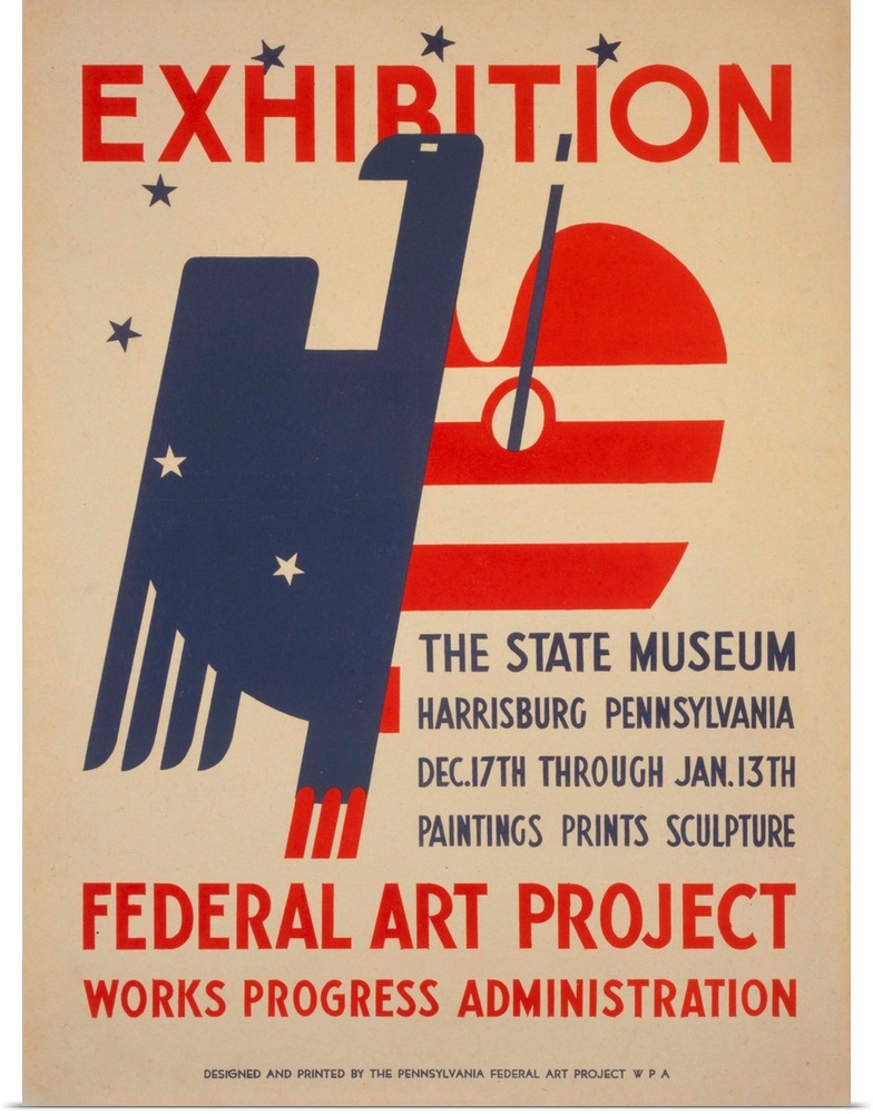 <p>Artwork for Federal Art Project exhibition of paintings, prints, and sculpture at the State Museum, Harrisburg, Pa., showing stylized eagle and palette.</p>