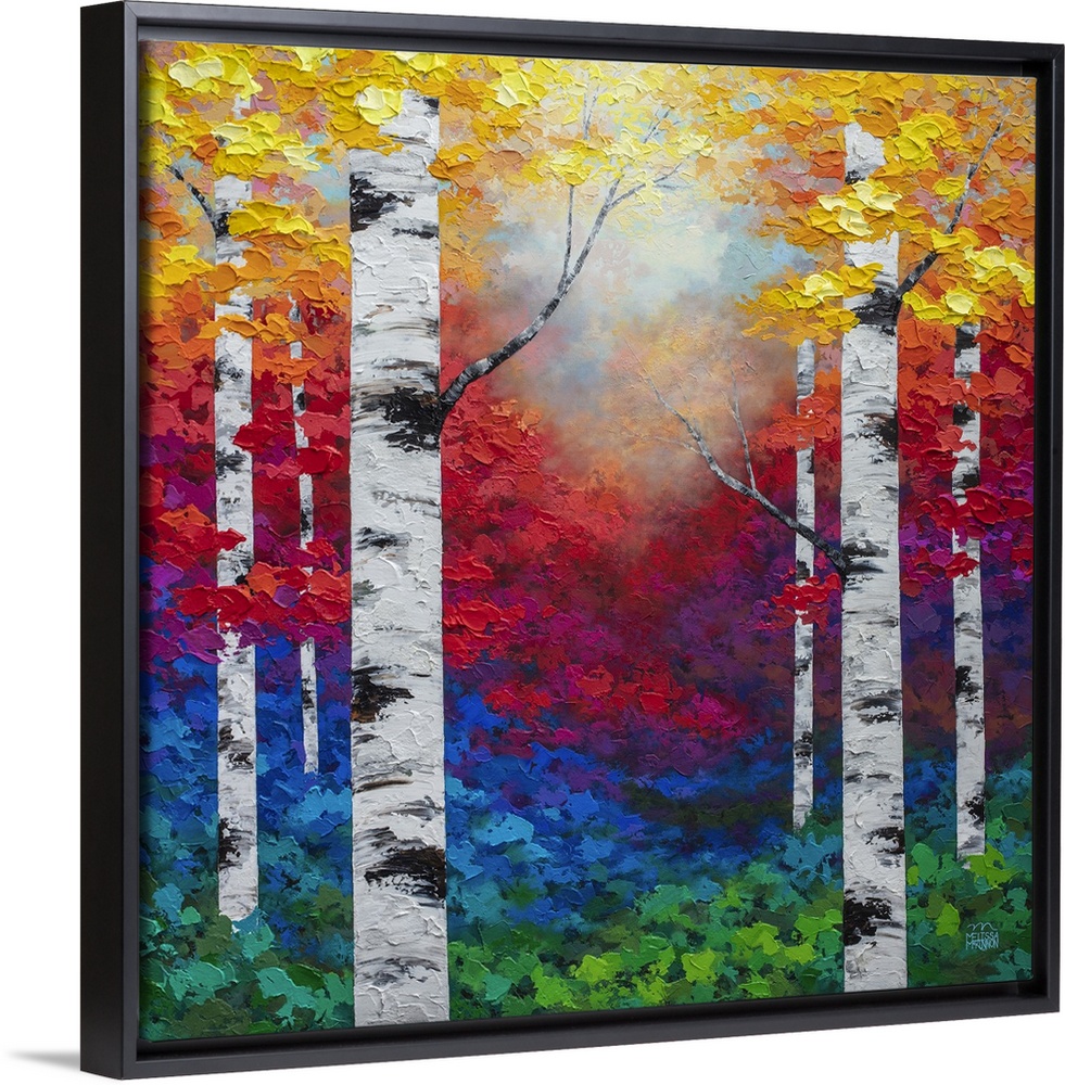 <p>Colorful autumn forest landscape painting of aspen trees and birch trees in the fall Giclee art print on canvas by contemporary abstract landscape artist Melissa McKinnon painted with palette knife and impasto texture.</p>