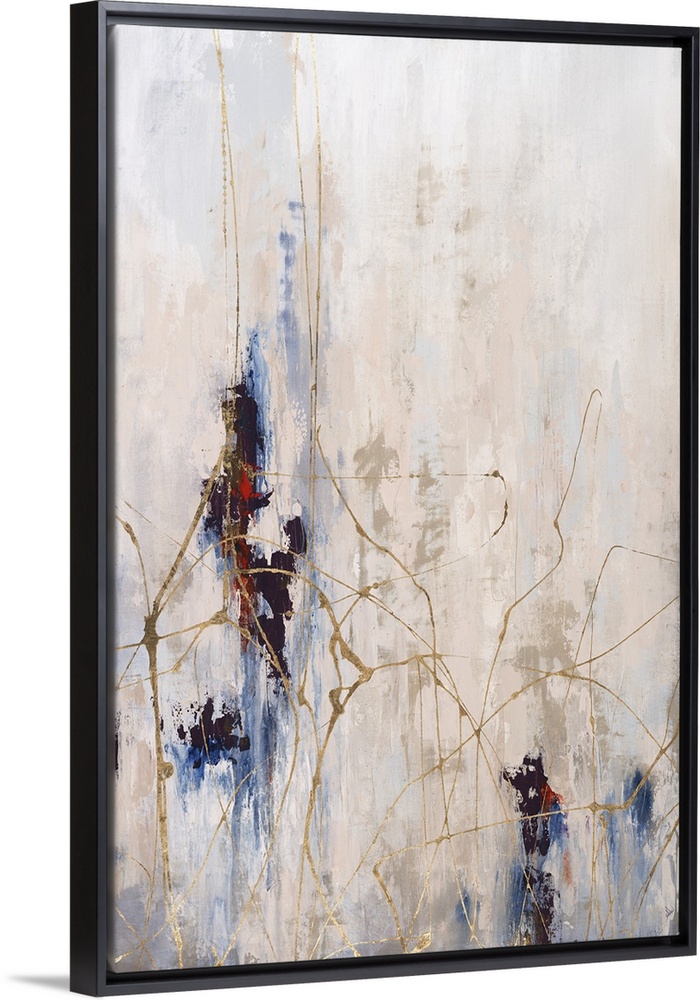 <p>Large abstract painting with a neutral colored background and streaks of red, blue, and dark purple towards the bottom half and thin gold lines all over.</p>