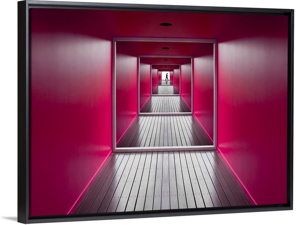 <p>A square shaped hallway with bright pink walls, and a figure at the exit.</p>