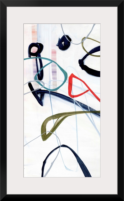 <p>A contemporary abstract painting of colorful bold lines hovering in an off-white space.</p>