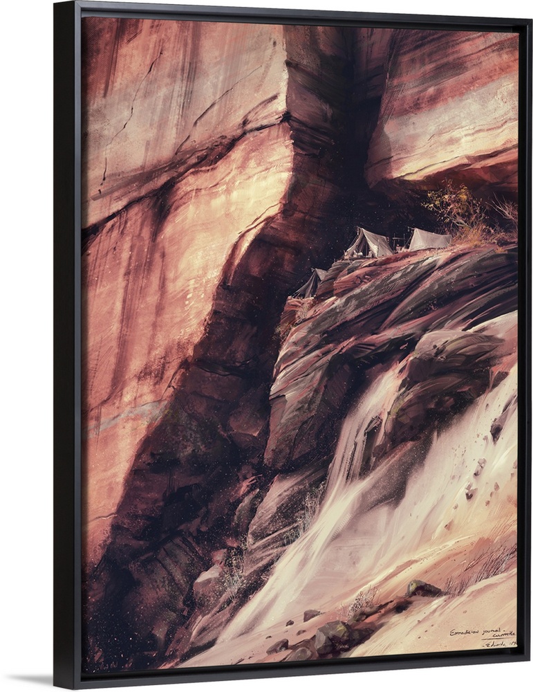<p>Painting of campsite on a face of a large desert cliff.</p>