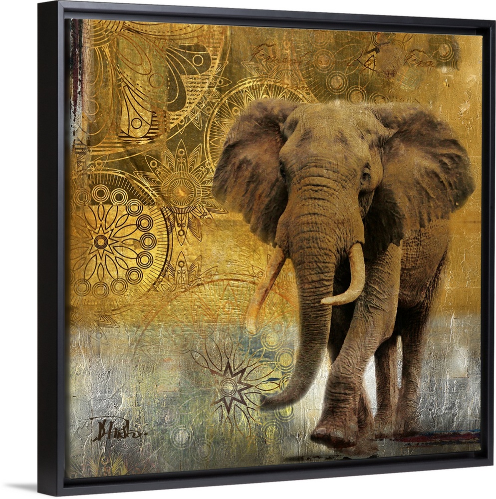<p>A large elephant walks straight forward with an eclectic design in the background.</p>