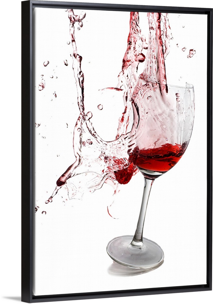 <p>Portrait photograph on a large wall hanging of a slightly tilted glass of red wine, the goblet appears to be exploding and wine is leaving the glass in all directions.</p>