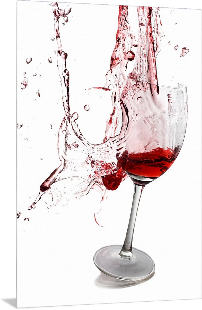 <p>Portrait photograph on a large wall hanging of a slightly tilted glass of red wine, the goblet appears to be exploding and wine is leaving the glass in all directions.</p>