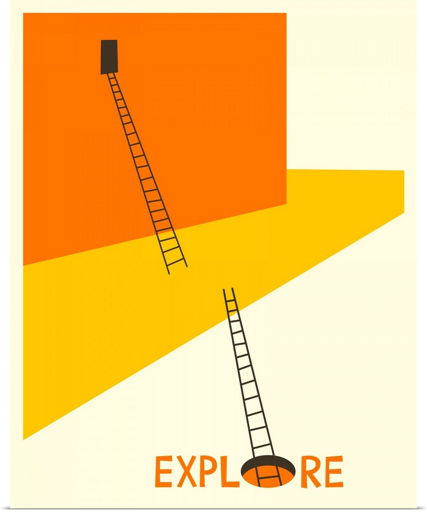 <p>Illustration of an orange and yellow building with two ladders leading to a hole in the ground, which represents the 'o' in "explore", written on the bottom.</p>