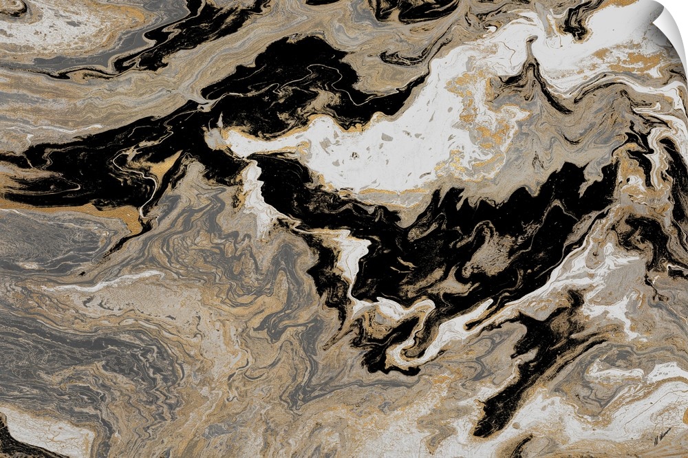 <p>A contemporary abstract painting with brown, gray, black, white and gold hues marbled together.</p>