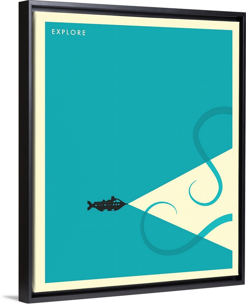 <p>Minimalist illustration of a submarine shining a white light towards two octopus tentacles, and the word "Explore" written in the top left corner, all on a bright blue background.</p>