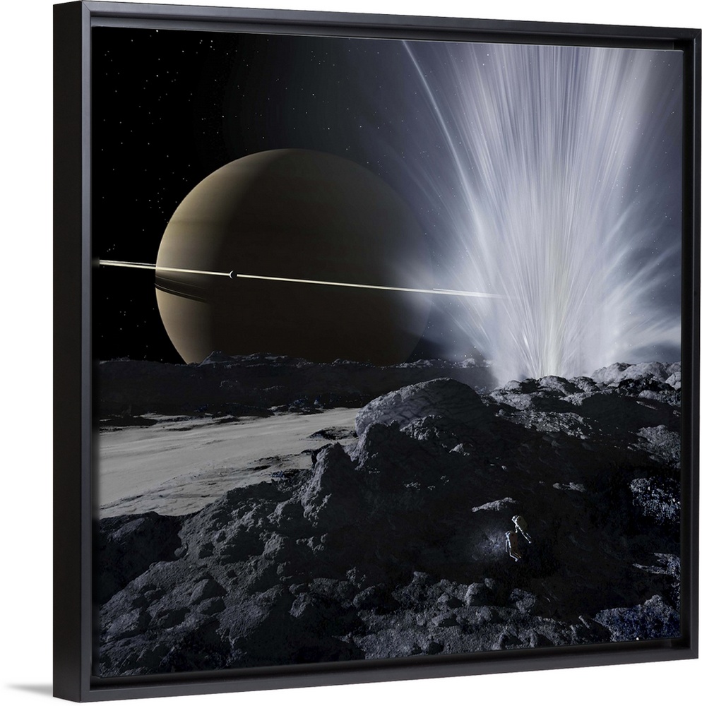 <p>Explorers examine one of the great fissures from which Enceladus' geysers erupt.</p>