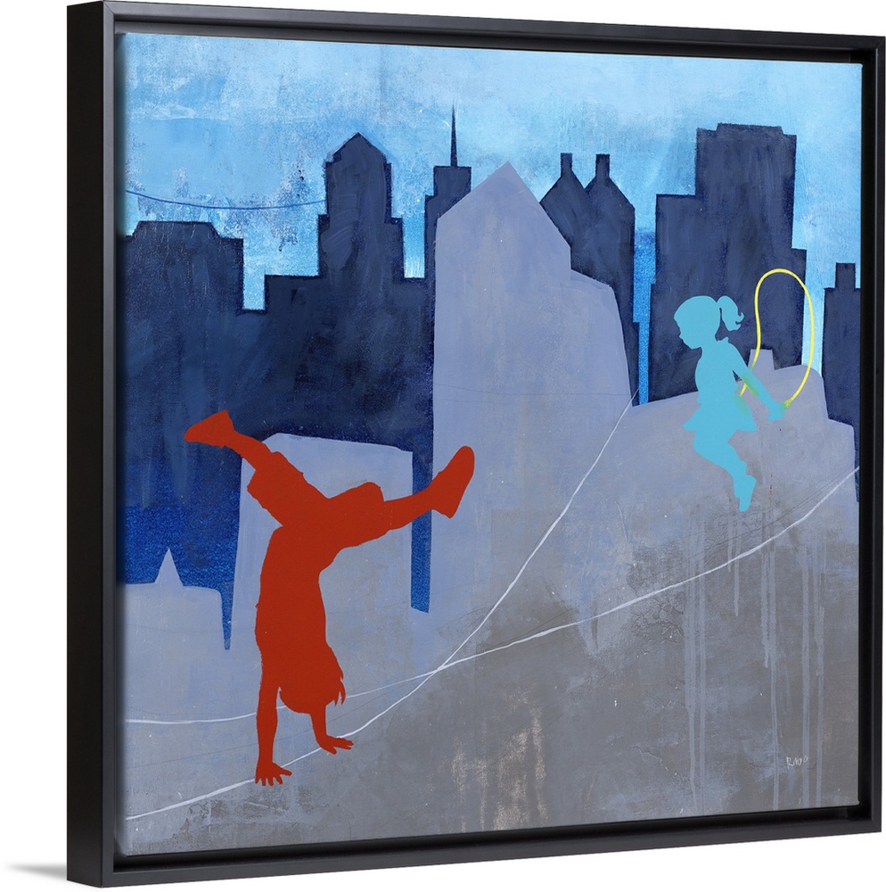 <p>Contemporary painting of two children playing outdoors with a city skyline in the background.</p>