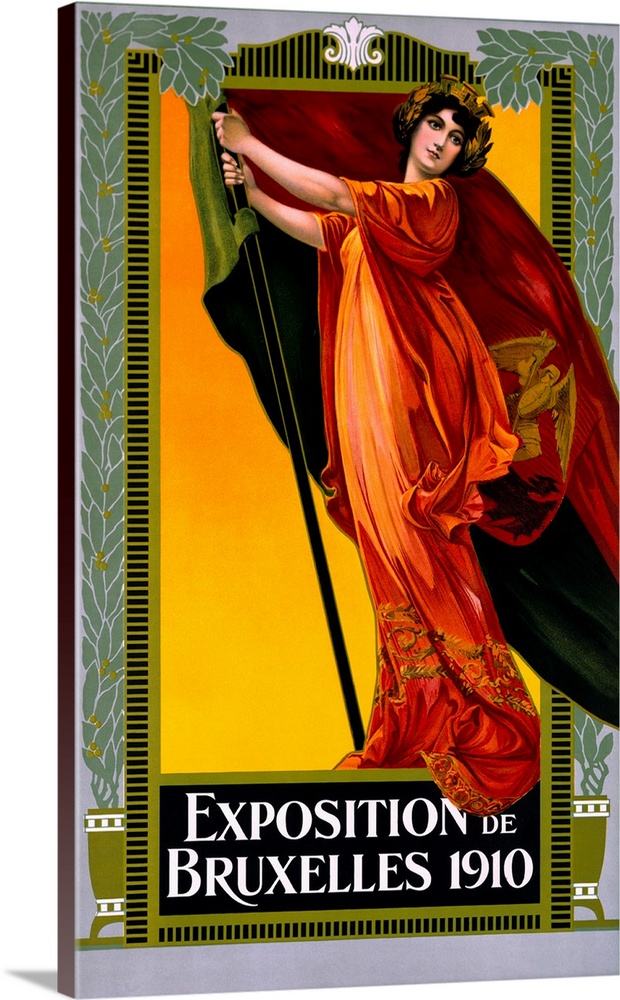 <p>A laureled women beckons us to the 1910 World's Fair in Brussels. The serene beauty of this laureled standard bearer, draped in a cascade of tangerine finery, flanked by climbing flora as the city of Brussels' colors and crest flutter in the wind, beckons us to the 1910 World's Fair being held in the Belgian capital.</p>
