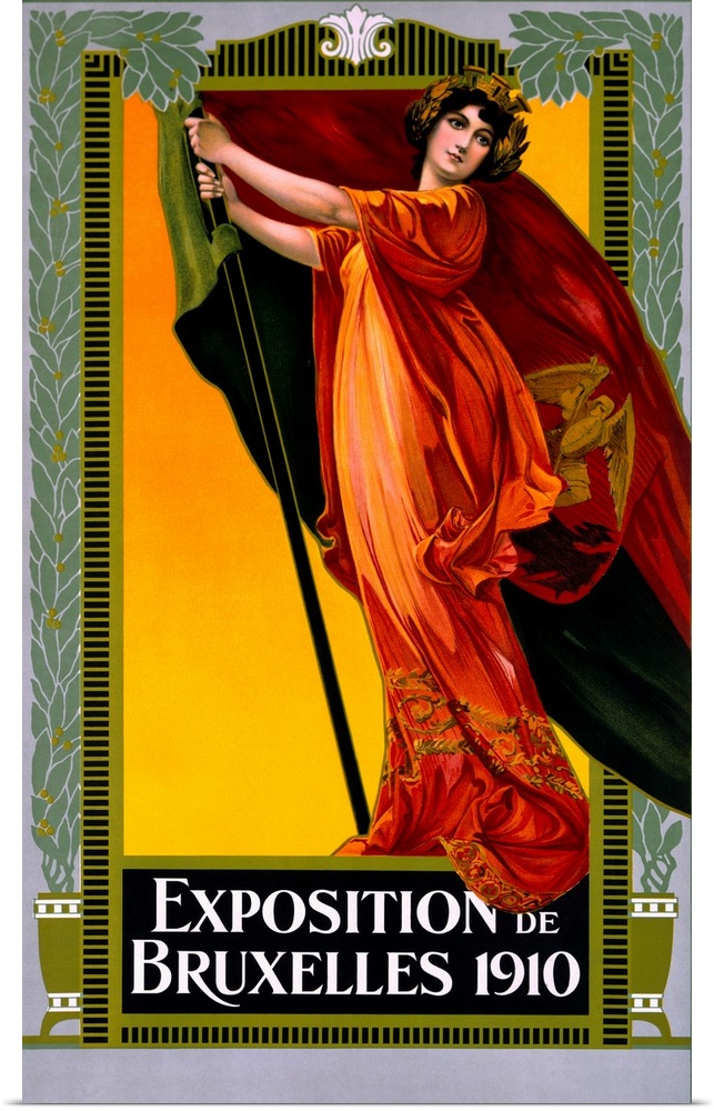 <p>A laureled women beckons us to the 1910 World's Fair in Brussels. The serene beauty of this laureled standard bearer, draped in a cascade of tangerine finery, flanked by climbing flora as the city of Brussels' colors and crest flutter in the wind, beckons us to the 1910 World's Fair being held in the Belgian capital.</p>