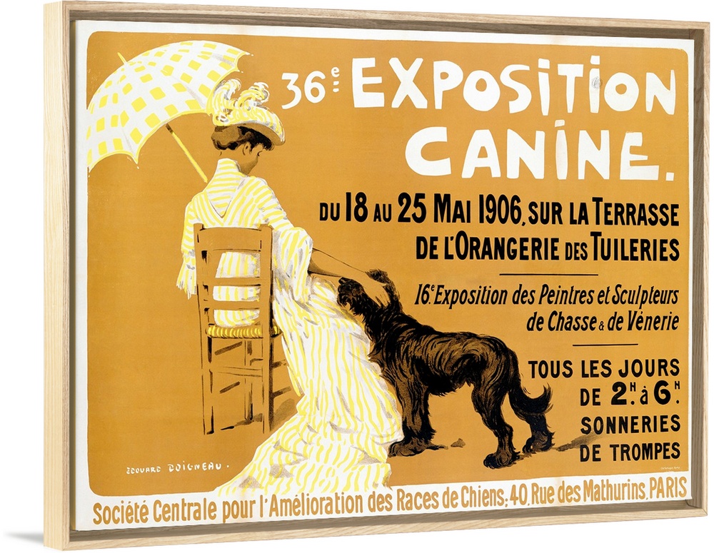 <p>Advertisement for the 36th Dog Show at l'Orangerie des Tuileries in Paris. The poster shows an elegant woman with a parasol petting a long-haired dog.</p>