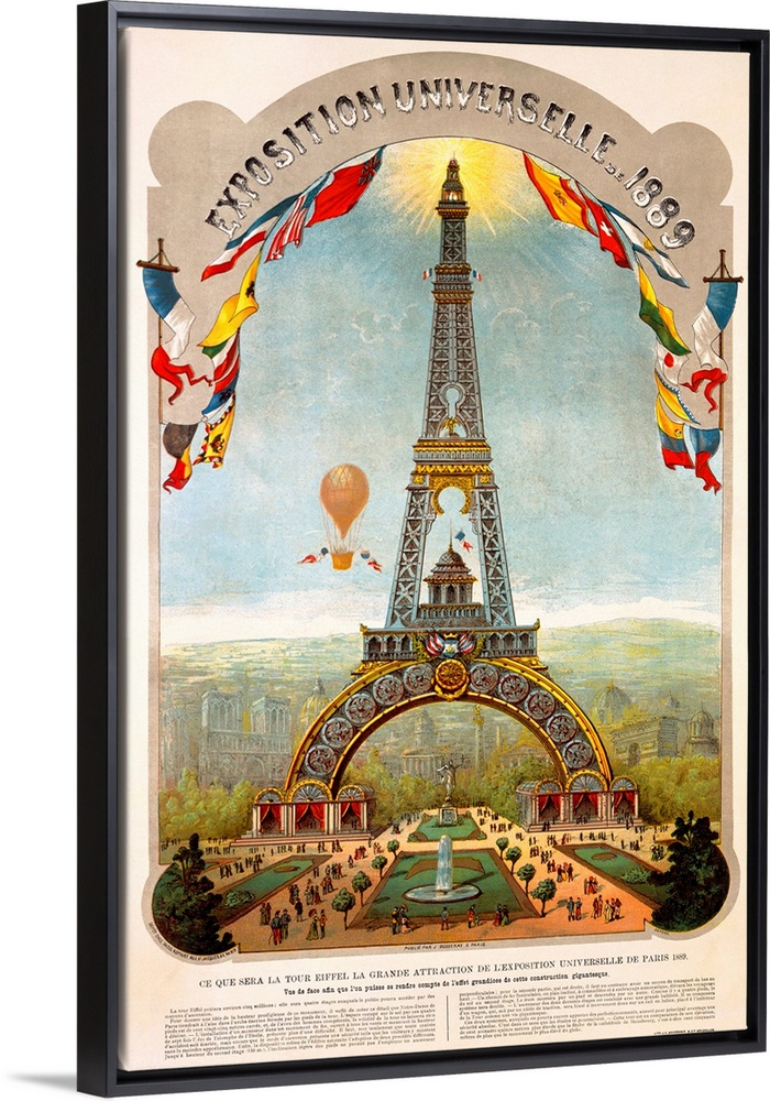 <p>Vertical canvas print of an antique poster of the Eiffel Tower with a hot air balloon in the sky.</p>