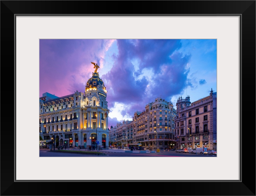 <p>Exterior of Metropolis Building at Dusk, Madrid, Spain.</p>