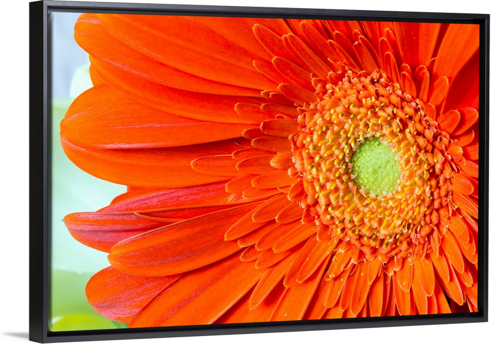 <p>Extreme close-up of an orange gerber daisy in bloom</p>