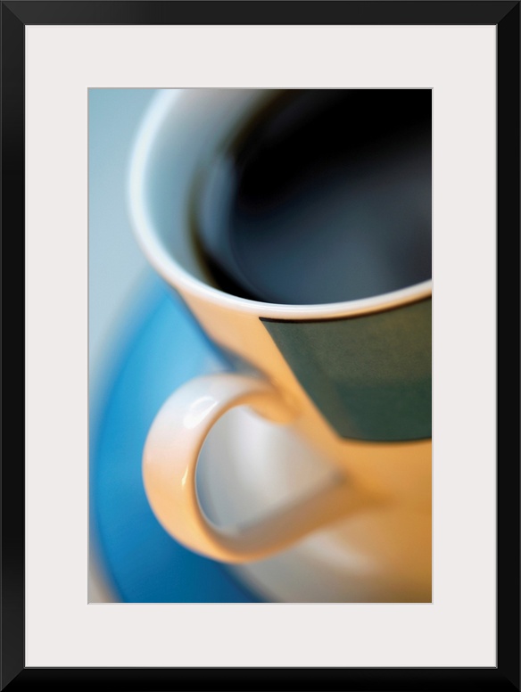 <p>Extreme close-up of cup of black coffee in tan and black cup with blue saucer</p>