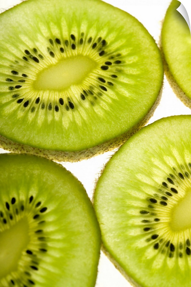 <p>Extreme close-up of four pieces of sliced kiwi fruit, part of</p>