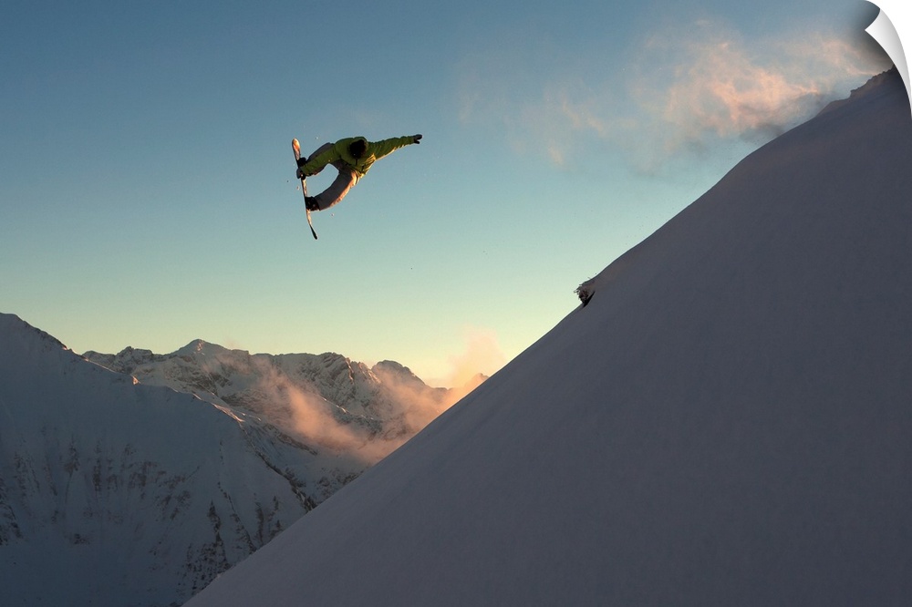 <p>Professional snowboarder, Frederik Kalbermatten, extreme snowboarding at sunset, Arlberg, Austria.</p>