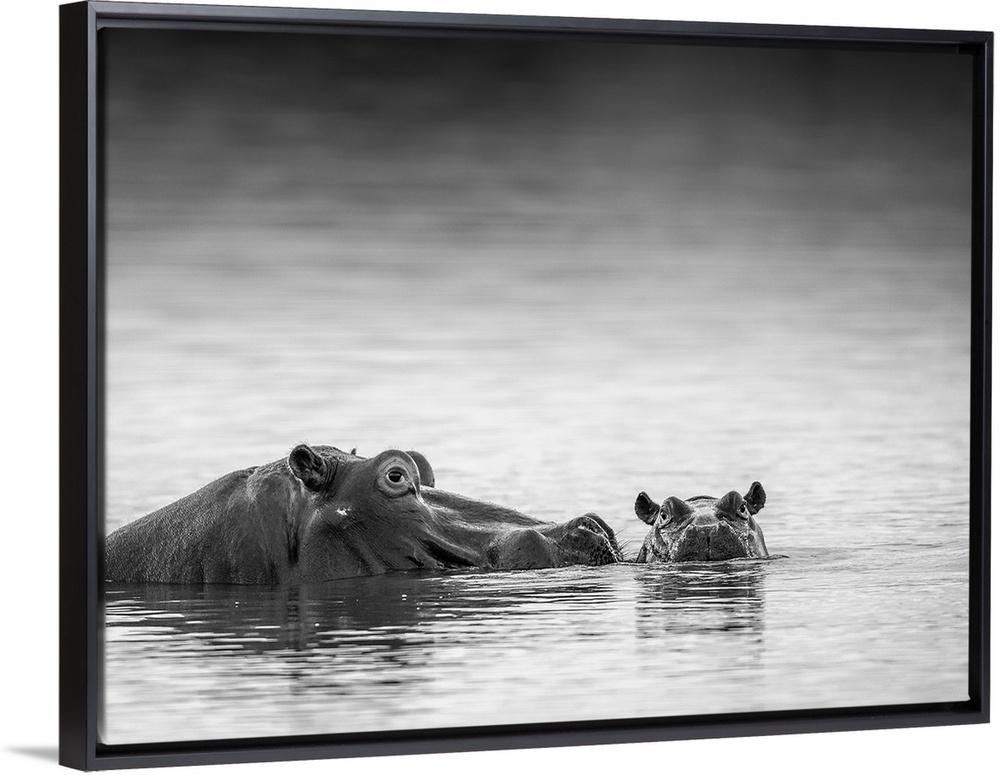<p>A black and white photograph of a mother hippo and her calf submerged halfway under water.</p>