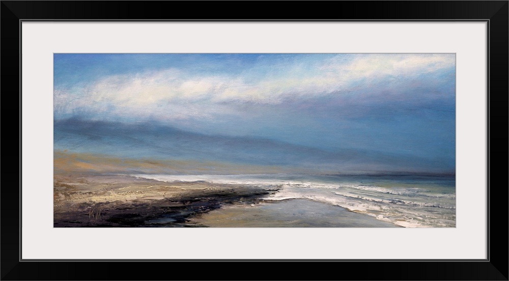 <p>Abstract beachscape painted in muted blues and browns.</p>