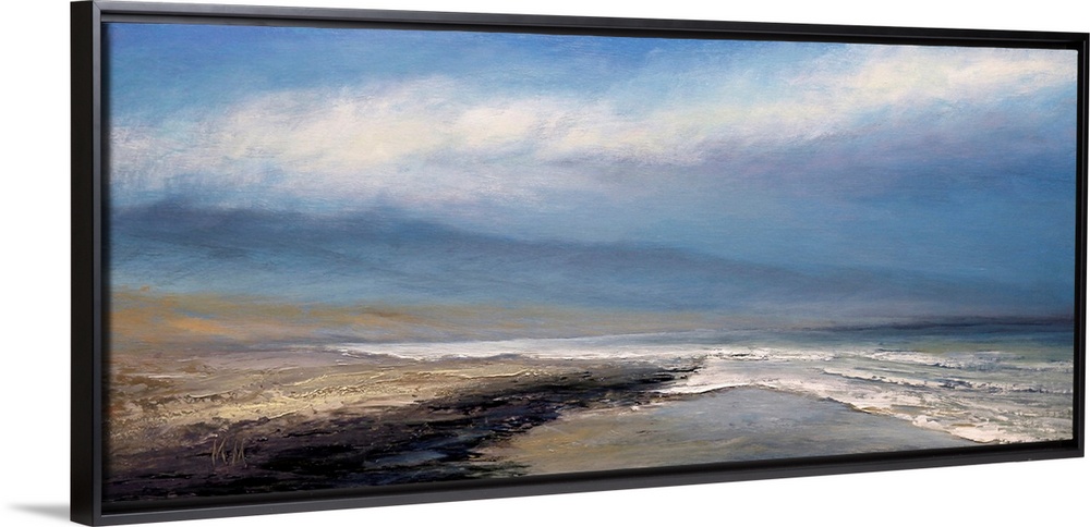 <p>Abstract beachscape painted in muted blues and browns.</p>