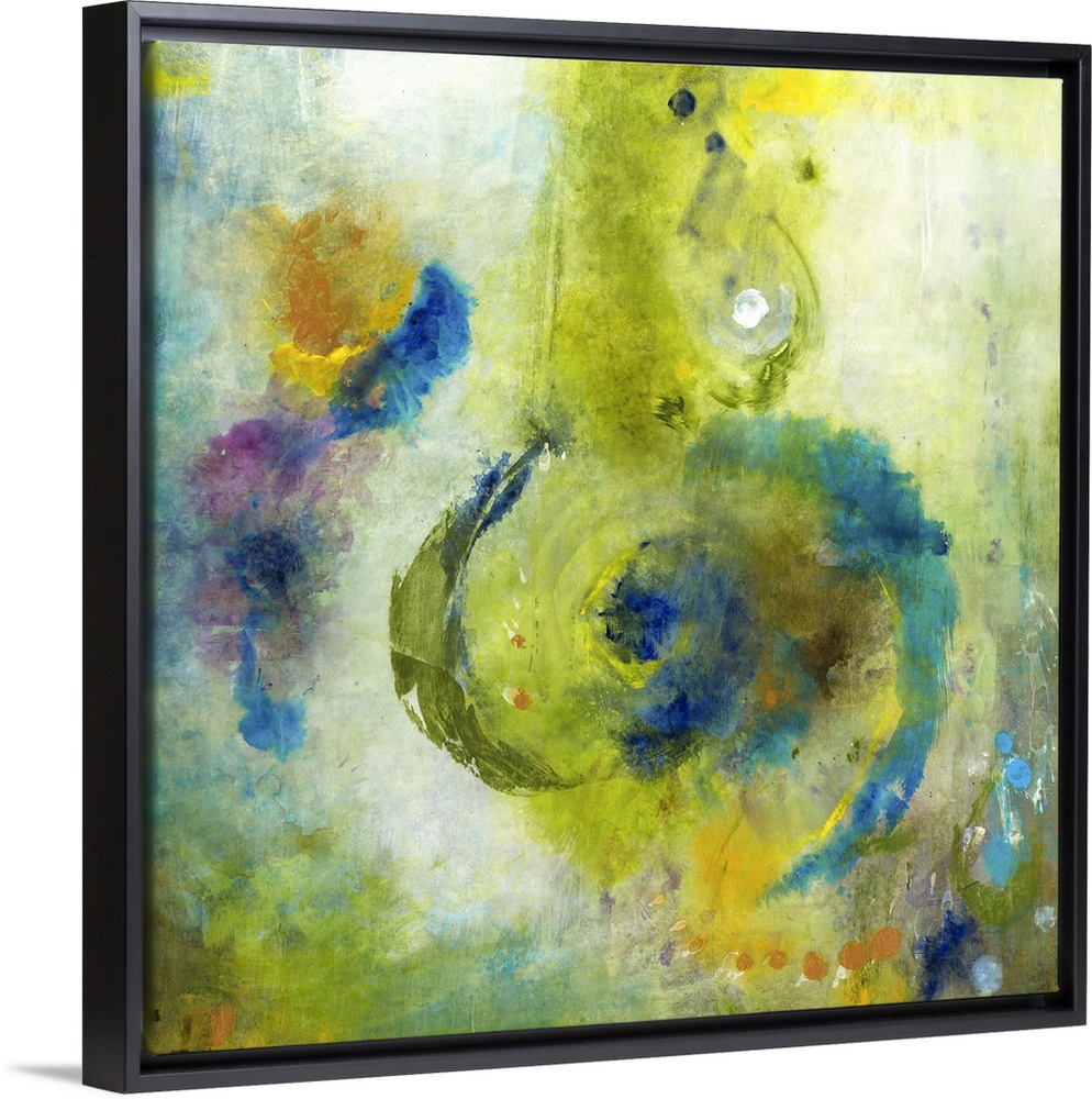 <p>A square abstract painting of swirled shapes in bright colored brush strokes such as green and blue.</p>