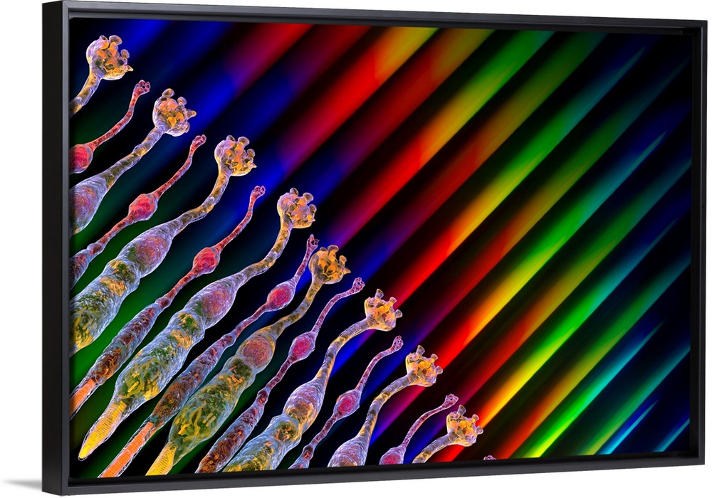<p>The retina, inside the eye, contains a light-sensitive membranous layer of cells. These are specialized nerve cells: elongated rods (flower like shapes) and cone-tipped cells, that produce vision. The rods are very sensitive and respond to dim light. With them the eye can detect images. While the cones are less sensitive but responsible for colour vision. Rods and cones pass visual signals through the optic nerve to the brain. Spectral colours above the cells represents light coming through the iris of the eye.</p>