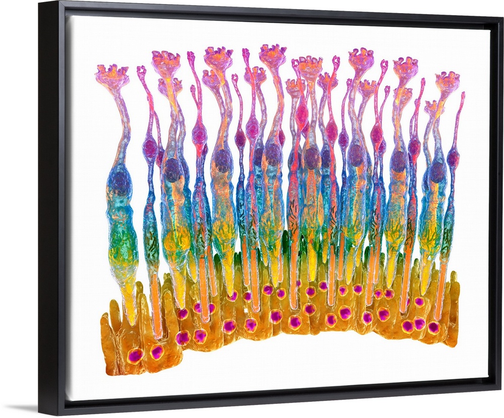 <p>The retina, inside the eye, contains a light-sensitive membranous layer of cells. These are specialized nerve cells: elongated rods (flower like shapes) and cone-tipped cells, that produce vision. The yellow structure at bottom represents the epithelium. The rods are very sensitive and respond to dim light. With them the eye can detect images. While the cones are less sensitive but responsible for colour vision. Rods and cones pass visual signals through the optic nerve to the brain.</p>