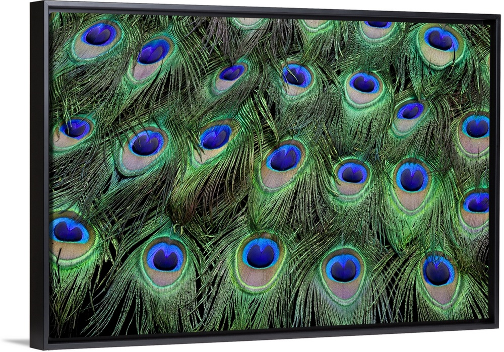 <p>Eye-spots on Male Peacock tail feathers fanned out in colorful designed pattern.</p>