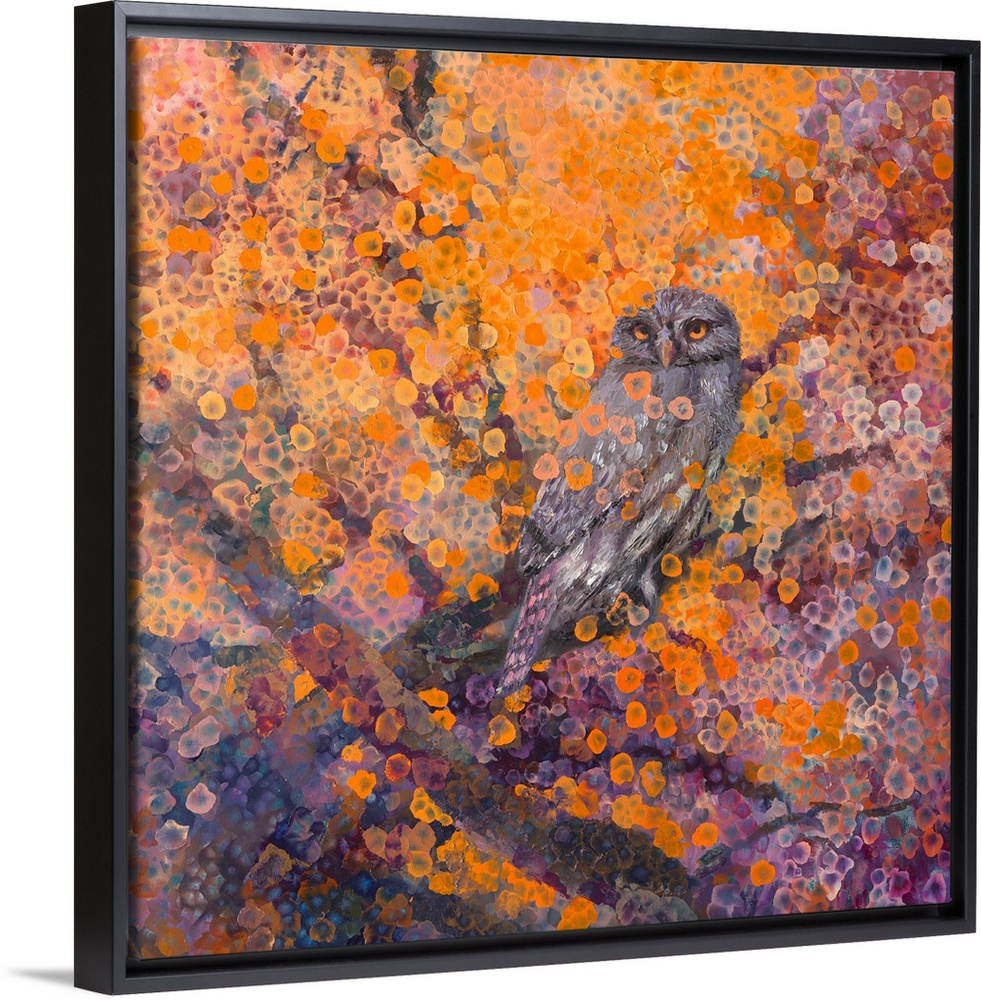 <p>Brightly colored contemporary artwork of a owl sitting in a tree.</p>