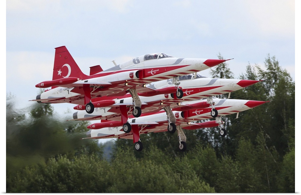 <p>F-5 Freedom Fighter/Tiger II jet fighters of the Turkish Stars taking off at ARMY-2017 military forum, Kubinka, Moscow Region, Russia.</p>