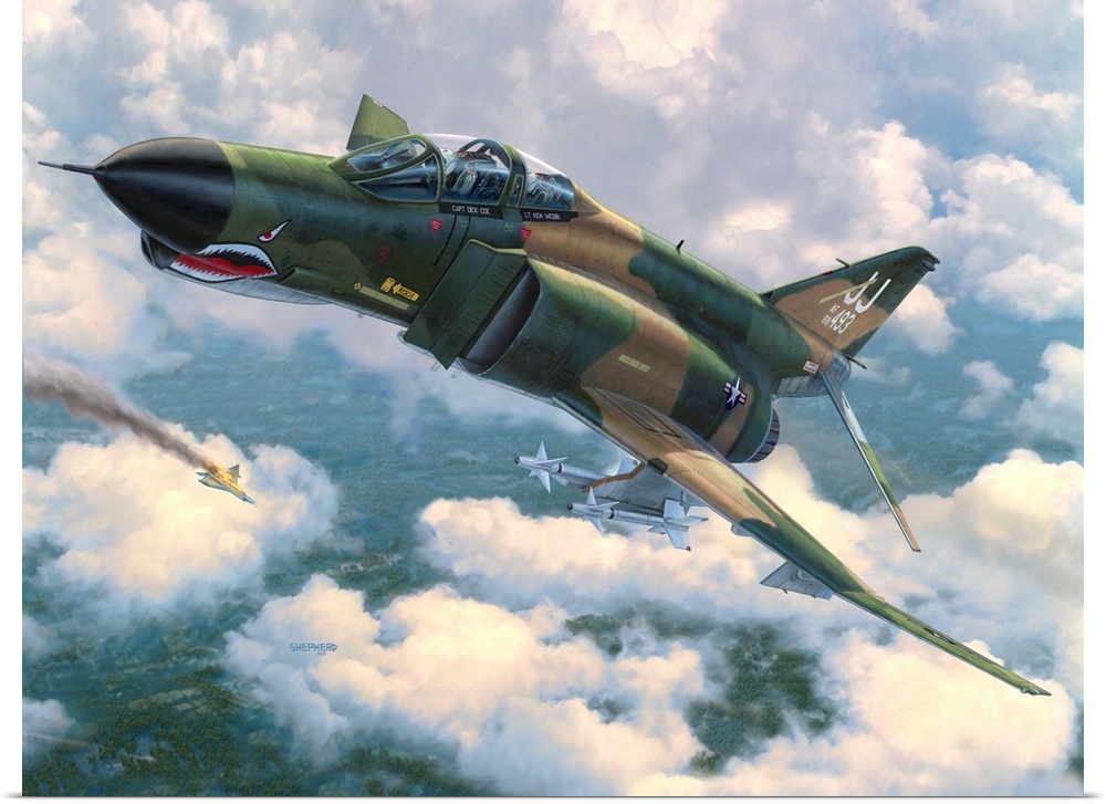 <p>An F-4E Phantom II flies in front of broken clouds over a tree covered jungle terrain with a North Vietnamese MiG 21 going down in flames in the background..This image depicts a U.S. Air Force Republic F-4E Phantom II downing a North Vietnamese MiG-21. Piloted by Capt. Dick Coe and RIO Lt. Ken Webb, this 34th TFS - 388 TFW Phantom shot down a MiG over North Vietnam on 5 October 1972. Using one of the then unreliable Sparrow missiles to force the MiG into a closer engagement, Dick Coe's shot managed to hit the MiG while the Phantom pulled heavy Gs to avoid another brace of MiGs. They made it home, but were unsure of the kill until it was confirmed the following day.</p>