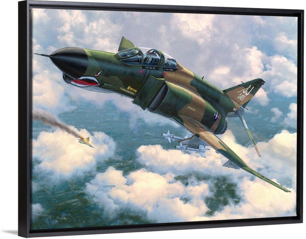 <p>An F-4E Phantom II flies in front of broken clouds over a tree covered jungle terrain with a North Vietnamese MiG 21 going down in flames in the background..This image depicts a U.S. Air Force Republic F-4E Phantom II downing a North Vietnamese MiG-21. Piloted by Capt. Dick Coe and RIO Lt. Ken Webb, this 34th TFS - 388 TFW Phantom shot down a MiG over North Vietnam on 5 October 1972. Using one of the then unreliable Sparrow missiles to force the MiG into a closer engagement, Dick Coe's shot managed to hit the MiG while the Phantom pulled heavy Gs to avoid another brace of MiGs. They made it home, but were unsure of the kill until it was confirmed the following day.</p>