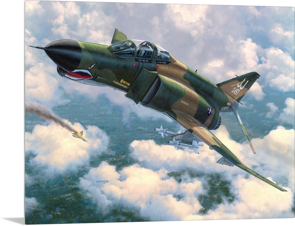<p>An F-4E Phantom II flies in front of broken clouds over a tree covered jungle terrain with a North Vietnamese MiG 21 going down in flames in the background..This image depicts a U.S. Air Force Republic F-4E Phantom II downing a North Vietnamese MiG-21. Piloted by Capt. Dick Coe and RIO Lt. Ken Webb, this 34th TFS - 388 TFW Phantom shot down a MiG over North Vietnam on 5 October 1972. Using one of the then unreliable Sparrow missiles to force the MiG into a closer engagement, Dick Coe's shot managed to hit the MiG while the Phantom pulled heavy Gs to avoid another brace of MiGs. They made it home, but were unsure of the kill until it was confirmed the following day.</p>