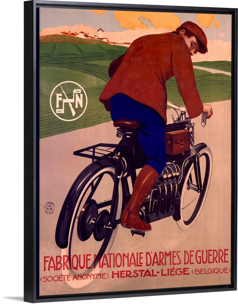 <p>This early 20th-century Belgian advertising poster showcases a man astride an FN (Fabrique Nationale) motorcycle, gazing confidently over his shoulder as he prepares to speed into the countryside. Rendered in a crisp Art Nouveau style, the composition emphasizes both motion and mechanical precision, with the fields and winding roads of rural Belgium setting a scenic backdrop. Originally a weapons manufacturer, FN diversified into motorcycles in the early 1900s, and this poster highlights the company's innovation and technical prowess.</p>