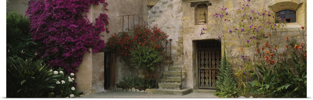 <p>Panoramic image of an Italian style stone house with large flowering bushes crawling up the side and a wrought iron staircase bending up the side of the house.</p>