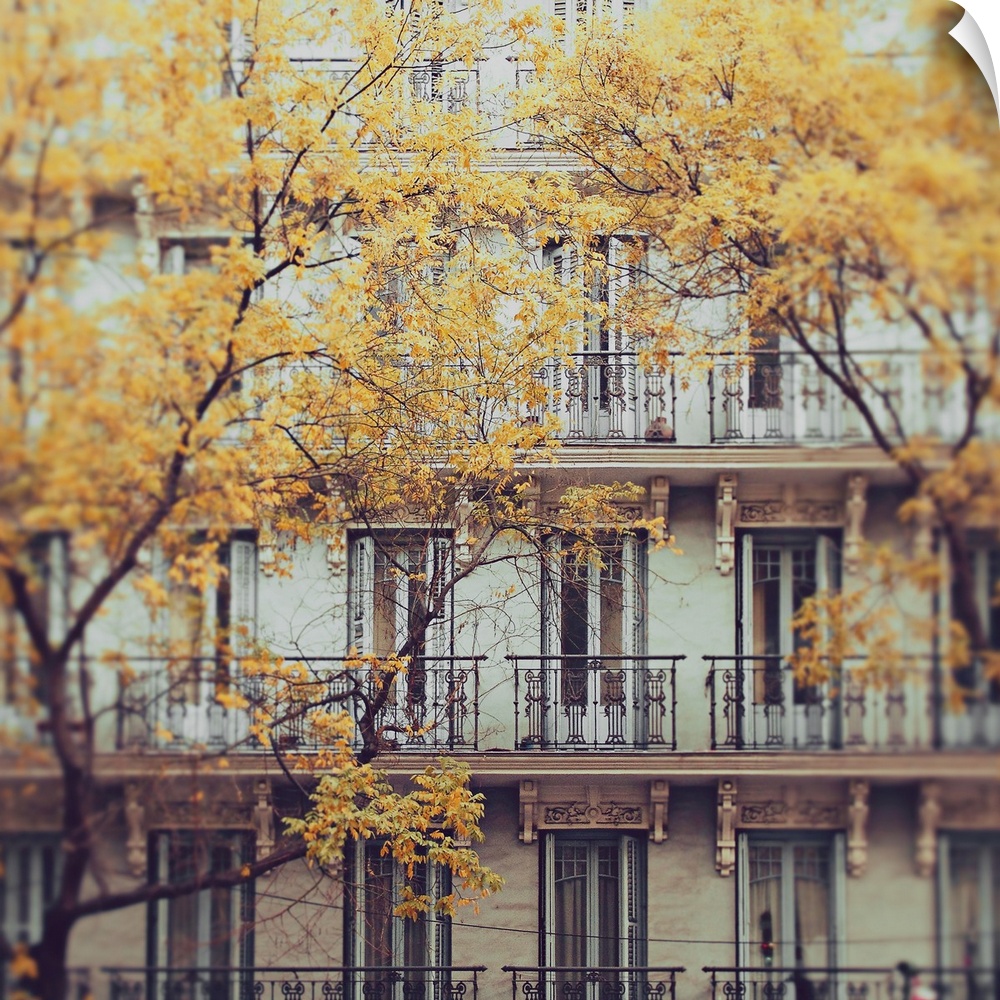<p>Facade of a c. 19th Century tenement house in central Madrid, in foreground trees with withered leaves in autumn.</p>