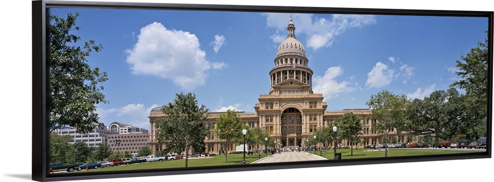 <p>The state capitol building in Texas is photographed in wide angle view showing the pathway and trees that line it going up to the front of the building.</p>