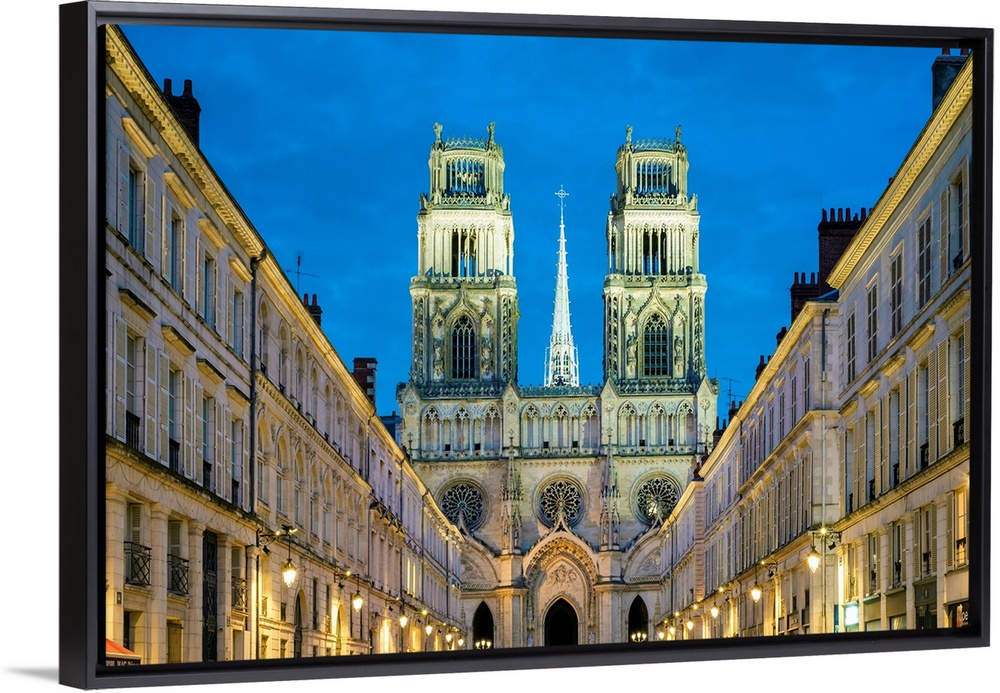 <p>Facade of Orleans Cathedral (Basilique Cathedrale Sainte-Croix) seen down Rue Jeanne d'Arc at dusk. Orleans, Loiret Department, Centre, France.</p>