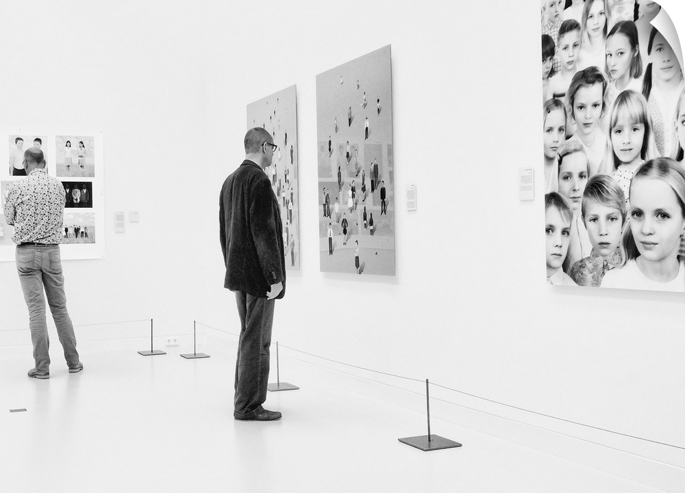 <p>A man in an art gallery looks at figurative artwork on the wall.</p>