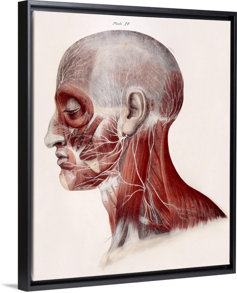 <p>Facial nerves. Historical anatomical artwork of a side view of a dissected human head showing the nerves (white) and muscles (red) of the face and neck. The facial nerves originate from a nerve called the seventh cranial nerve, also called the facial nerve. The left-hand facial nerve is seen here, emerging from below the ear. It branches out to ennervate the muscles of the face and scalp, and also the salivary glands and lacrimal glands of the eye (for tears). Sensory information comes from the tongue. Separate nerves in the neck run to the back of the scalp and to neck muscles. Artwork from The Nerves of the Human Body (Ed. Jones Quain, 1839).</p>