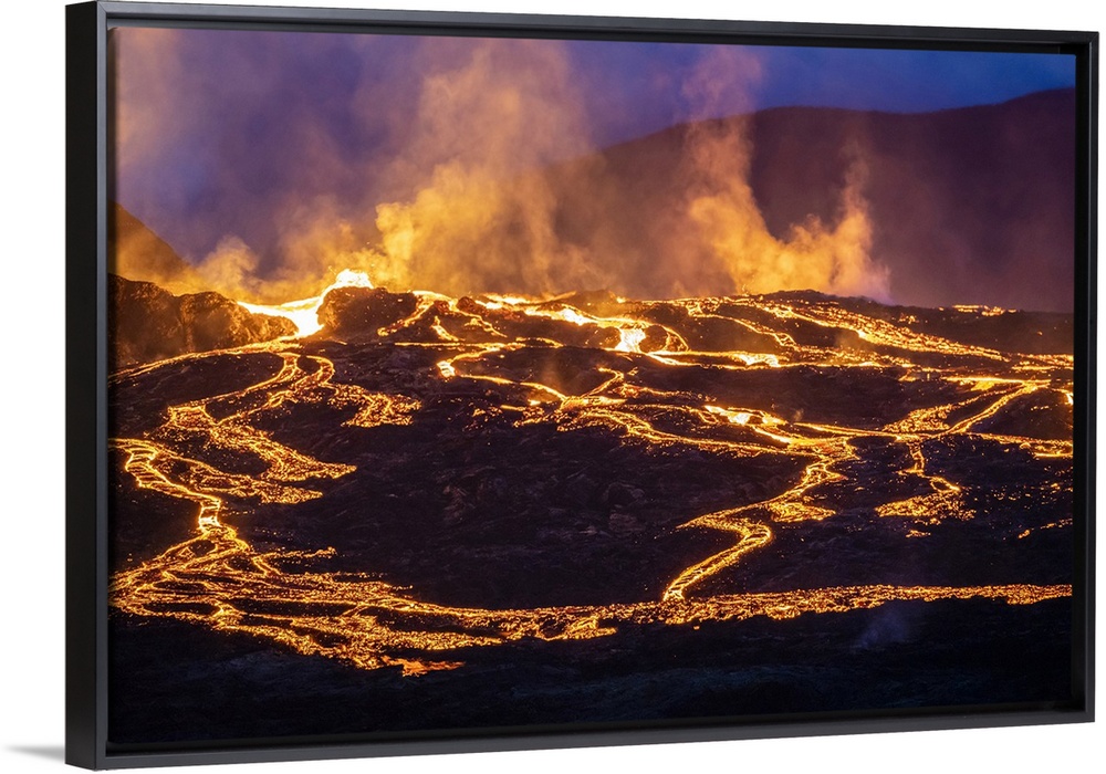 <p>Fagradalsfjall volcano eruption at night, Geldingadalir, Reykjanes Peninsula, Iceland.</p>