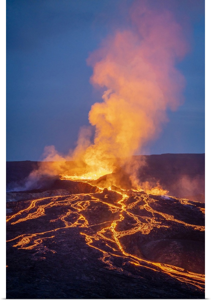 <p>Fagradalsfjall volcano eruption at twilight, Geldingadalir, Reykjanes Peninsula, Iceland.</p>