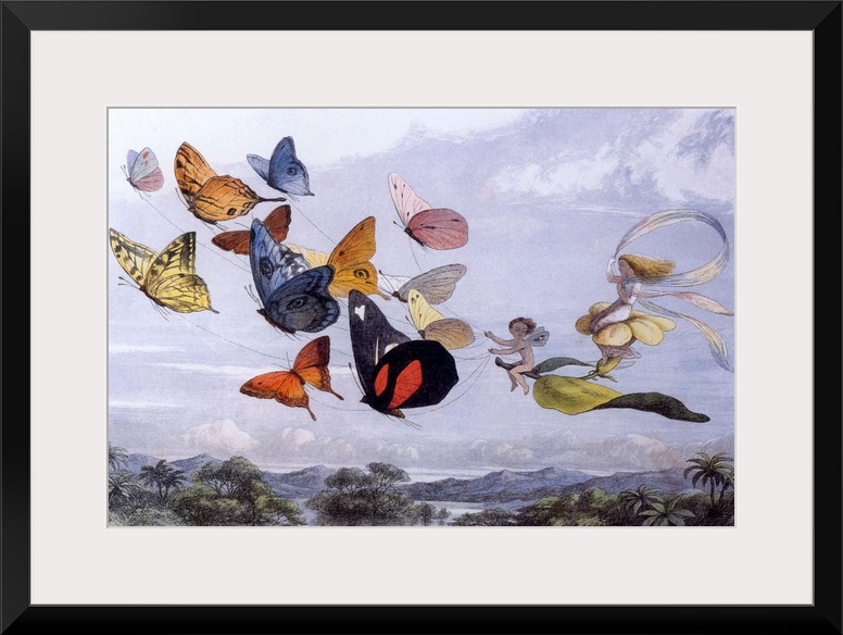 <p>A vintage illustration of a fairies flying with colorful butterflies.</p>