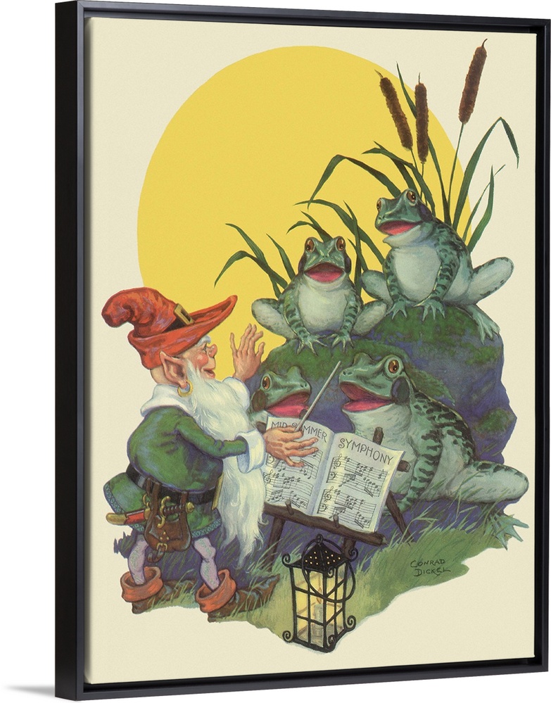 <p>A vintage illustration of a gnome with a red hat singing with some frogs.</p>