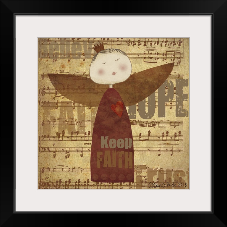 <p>Square framed contemporary art with an angel figure in the center of the image. Surrounded by sheet music in the background.</p>