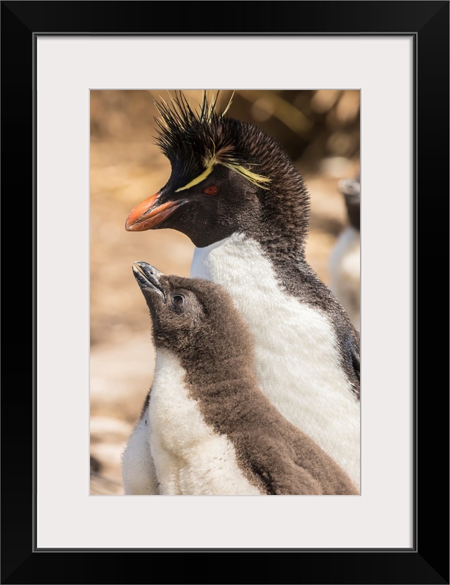 <p>Falkland Islands, Bleaker Island. Rockhopper penguin adult and chick.</p>
