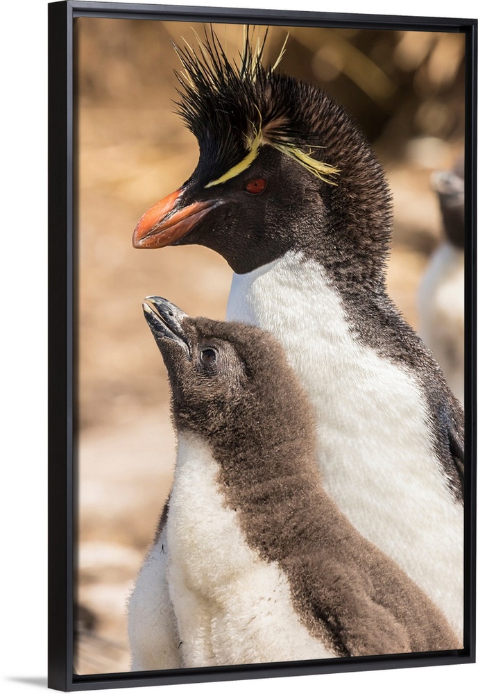 <p>Falkland Islands, Bleaker Island. Rockhopper penguin adult and chick.</p>