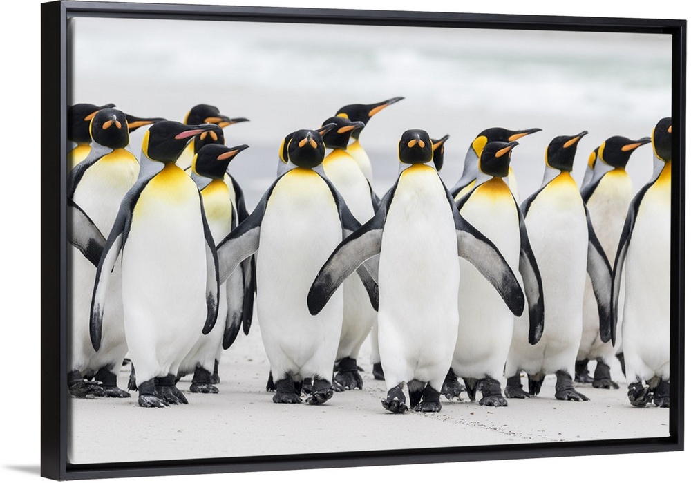 <p>King Penguin (Aptenodytes patagonicus) on the Falkand Islands in the South Atlantic. Group of penguins marching on sandy beach towards their colony. South America, Falkland Islands, January</p>